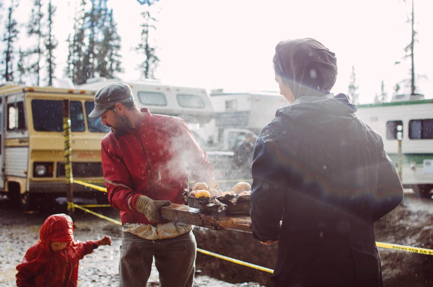 There were at least 20 families at our friend's Max place to celebrate Pascal big 40 and a few other birthdays, twice as many kids and probably half as many dogs. It rained most of the afternoon and his house building site became a big mud hole for the kids to enjoy! There were two bonfires going, lots of tarps and a few campers with lit woodstoves. The sun kept coming and going and there was quite a bit of rainbow spotting.